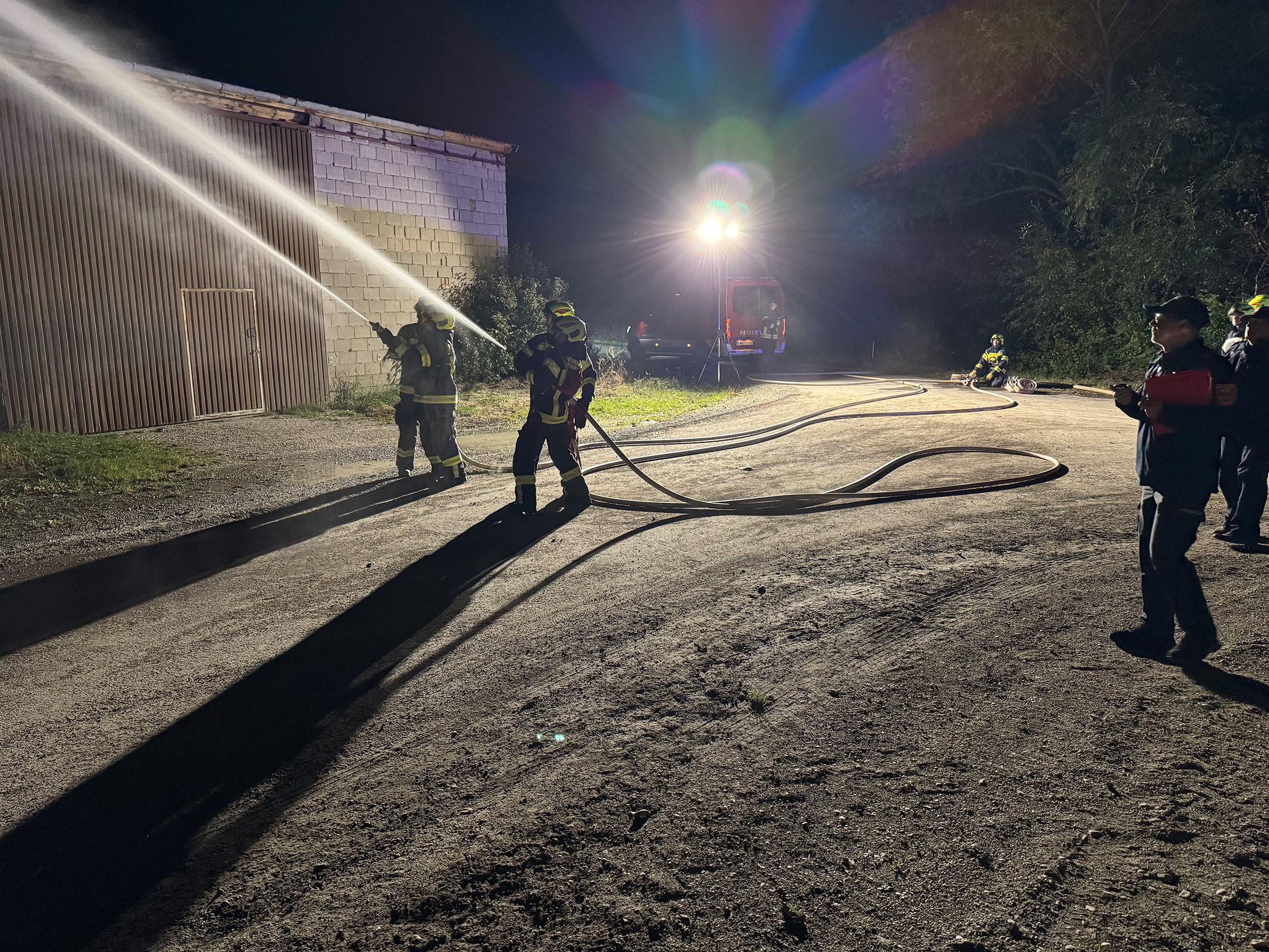 Die praktische Übung wurde möglichst Realitätsnahe angesetzt. Die Wasserentnahme erfolgte mittels Tragkraftspritze aus einem Bach; simuliert wurden ein Holzstapelbrand und ein Schuppenbrand.