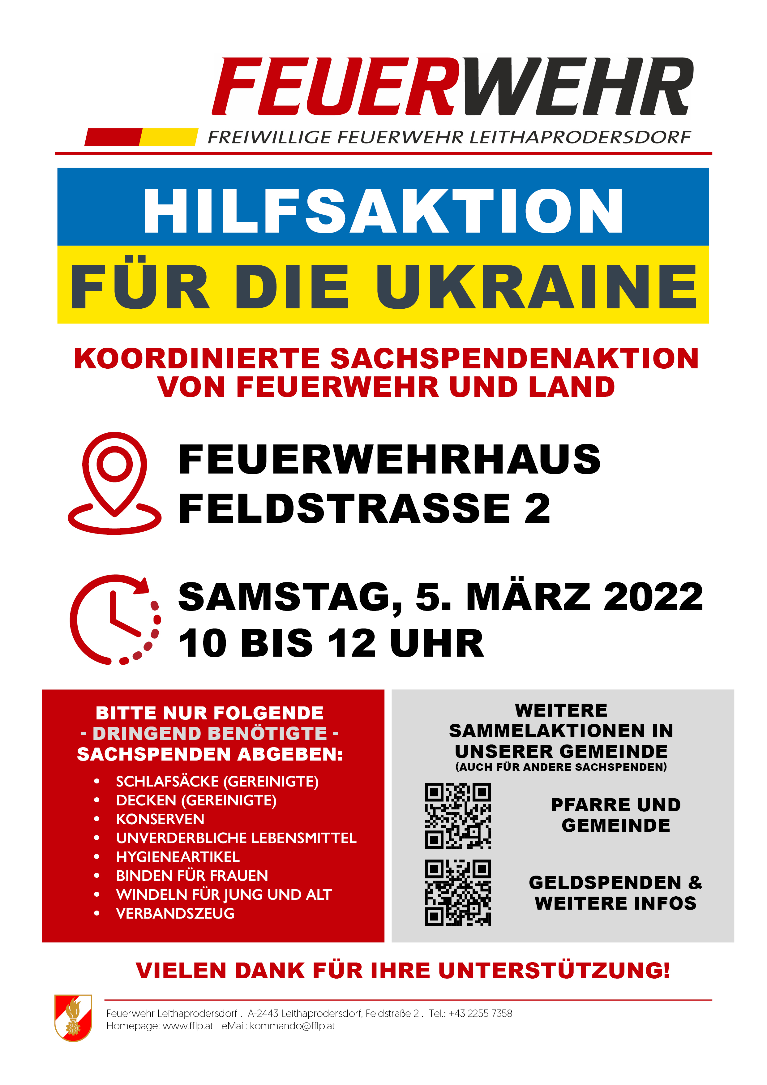Die Hilfsgüter können im Feuerwehrhaus Leithaprodersdorf (Feldstraße 2) am